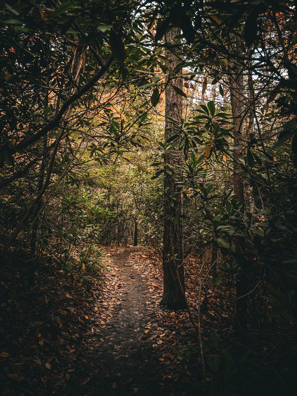 A clearing in a rhododendron tunnel along the Endless Wall Trail in New River Gorge National Park